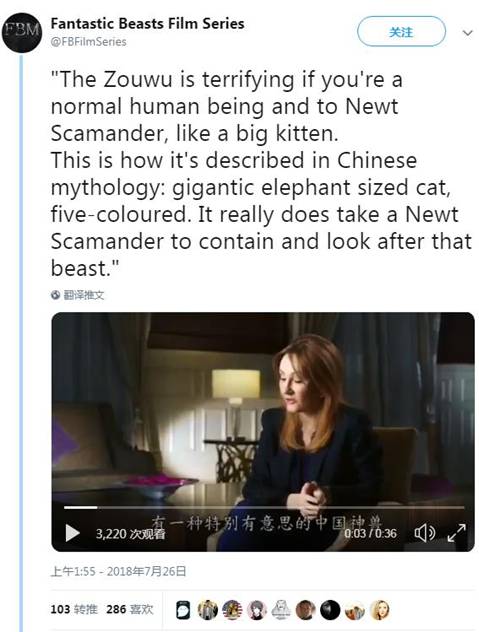 罗琳本人也曾亲自介绍说,驺吾是中国神话里一种特别有意思的神兽,在普通人看来很吓人,但对热爱神兽的纽特来说,驺吾就像一只大猫,只有纽特才能制服和照顾。