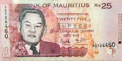 印有朱梅麟头像的毛里求斯25卢比纸币。