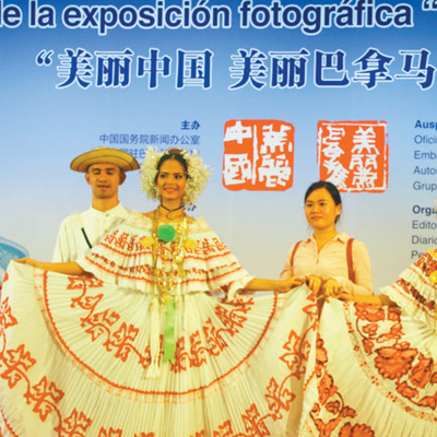 11月22日,习近平主席访问巴拿马前夕,“美丽中国美丽巴拿马”图片展在巴拿马拉美议会大厦举行。图为在图片展开幕式上,观众与当地舞蹈演员合影。