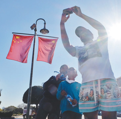 7月24日,为欢迎习近平主席来访,南非总统府前的道路两旁挂起五星红旗。图为当地民众与中国国旗合影。