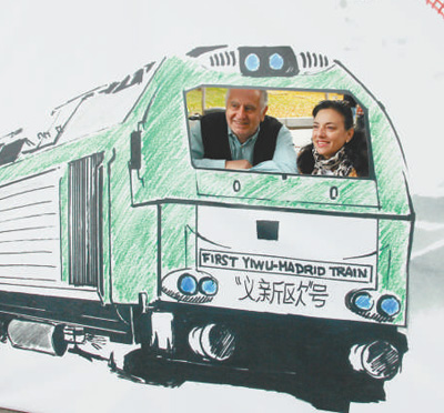 11月18日,西班牙马德里市民与“义新欧”中欧班列卡通画板合影。