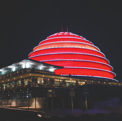 7月22日,为欢迎习近平主席来访,卢旺达基加利会议中心披上中国国旗颜色。