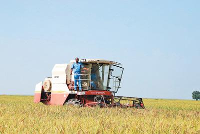 丰收季节,收割机正在瓦拉农场的稻田里工作。本报记者 姜 宣摄