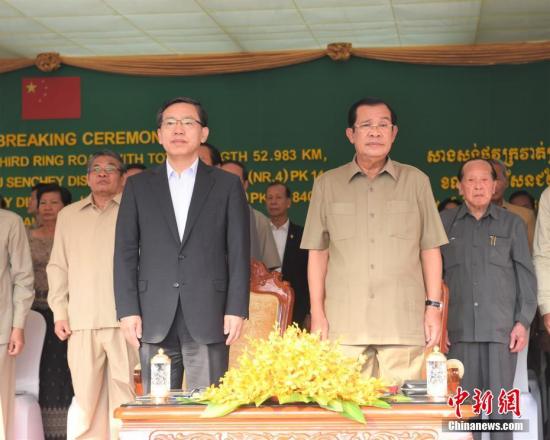 中新社金边1月14日电 (记者 黄耀辉)中国政府优惠信贷项目柬埔寨金边第三环线公路,当地时间1月14日在金边举行开建典礼。柬埔寨首相洪森,中国驻柬大使王文天、商务参赞李岸,以及中柬各界代表万余人到场出席典礼仪式。