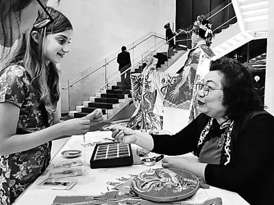 美国姑娘兰思雅在学习广州戏服制作中的穿珠工艺。本报记者 汤先营摄/光明图片