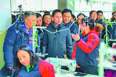 2018年12月29日,在新疆喀什市职业技能教育培训中心,12国驻华使节及使节代表与正在接受裁剪缝纫技能培训的学员交流。新华社发