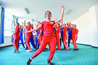 2018年10月7日,在学习之余,新疆和田县学员吾尕丽妮萨·麦麦提(前)和其他学员在教培中心一起跳舞。新华社发