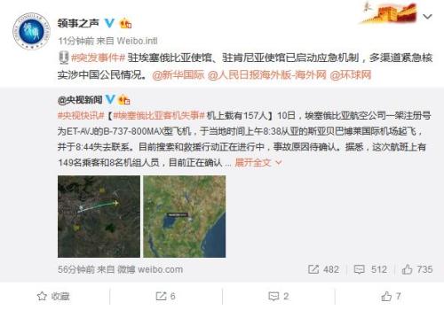 中新网3月10日电 据外媒报道,10日,埃塞俄比亚航空公司一架客机坠毁,机上载有149名乘客和8名机组人员,事故造成人员死伤。外交部领事保护中心官方微博发布消息称,驻埃塞俄比亚使馆、驻肯尼亚使馆已启动应急机制,多渠道紧急核实涉中国公民情况。
