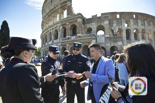 2016年5月2日,中方警员与意大利同行在罗马斗兽场外执行联合巡逻。新华社记者金宇摄