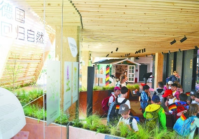 “德国馆必须要去的,你在里面可以看到完整的未来城市生态系统。”从北京市西城区大老远赶来的灰灰小朋友不太喜欢排队这件事,带他来的妈妈吴女士认真安抚着五岁的儿子。灰灰似乎并不太明白“生态系统”这个词,妈妈领他抬头望向围绕展馆一周的木质架子,耐心给他讲解上面陈列的每种花草:紫雏菊、凤梨鼠尾草、夏日风轮菜、欧石楠、红剪秋罗……这些姹紫嫣红的花草显然吸引了孩童的注意力,缓解了带娃排队妈妈的麻烦。妈妈又让灰灰向下看去,步道旁正有潺潺流水。玩着水,不一会儿,队排到了!