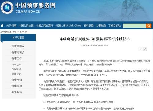 近年来,美东地区电信诈骗活动持续多发,2017年下半年以来,驻纽约总领馆多次发布提醒,提示领区中国公民提高警惕,防范各类电信诈骗,但侨胞和留学生上当受骗的情况仍时有发生。