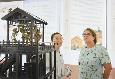 6月11日,在维也纳联合国国际会议中心,联合国外层空间事务办公室主任迪皮波(右)参观中国古代计时装置水运仪象台。