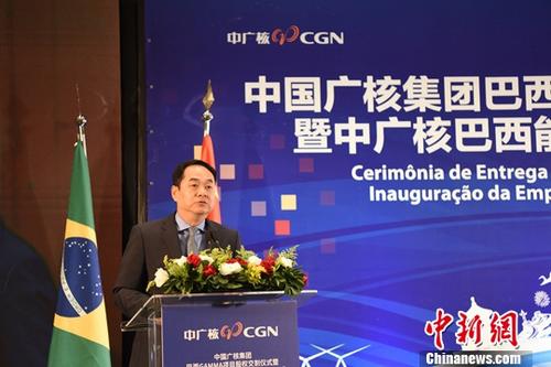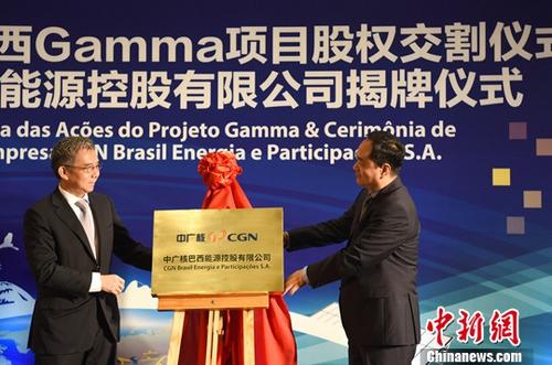 图为中广核董事长贺禹(左)和中国驻巴西大使杨万明为中广核巴西能源控股有限公司成立揭牌。中新社记者 莫成雄 摄