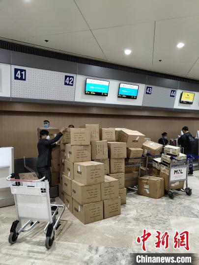 6时48份,厦门航空MF818航班起飞,免费将这批捐助物资运往泉州。该批物资将于当晚9时抵达泉州,交由当地卫生防疫部门,协助安排驰援武汉。图为物资在托运中。 厦航马尼拉办事处供图 摄