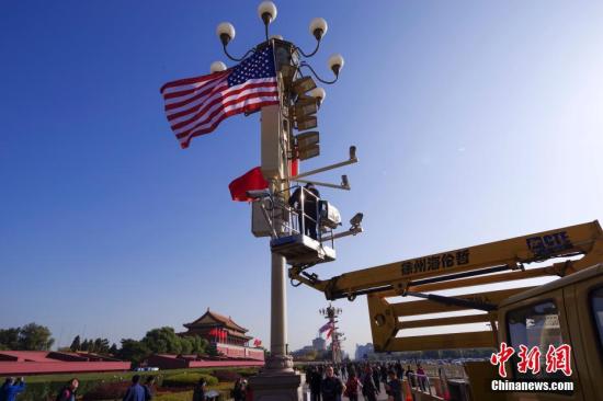 资料图片:北京天安门前悬挂中美两国国旗。中新社记者 贾天勇 摄