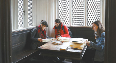 4月16日,在英国曼彻斯特的切塔姆图书馆,参观者在马克思和恩格斯曾使用过的书桌上翻阅书籍。马克思和恩格斯当年曾使用过的一张长方形橡木书桌,如今仍完好地存放在阅览室里。正是围绕着这张木桌,马克思与恩格斯查阅大量资料,展开思想交流,酝酿了包括《共产党宣言》在内的诸多马克思主义经典之作。