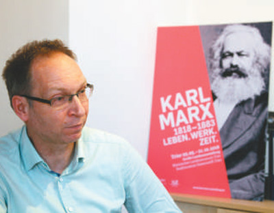 德国特里尔,马克思主题展览公司负责人、德国历史学者赖纳·奥茨为记者介绍将于5月5日开展的马克思主题展览。