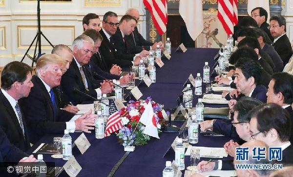当地时间2017年11月6日,日本东京,日本首相安倍晋三与美国总统特朗普举行正式会晤。(图片来源:视觉中国)