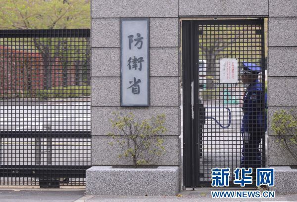 资料图:在日本东京的防卫省总部,一名工作人员在大门旁守卫。新华社发