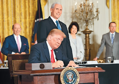 6月18日,美国总统特朗普在“国家太空委员会”会议上签署“太空政策指令-3”。新华社/美联