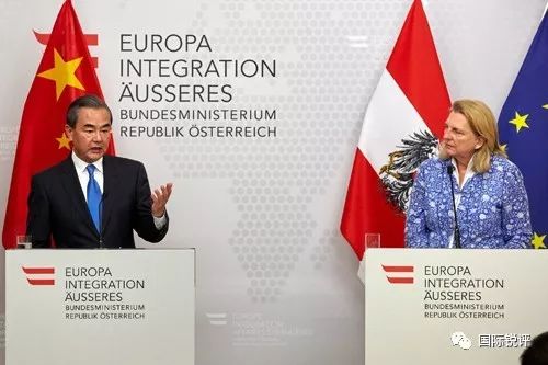 当地时间2018年7月5日,国务委员兼外交部长王毅在维也纳同奥地利外长克奈斯尔共同会见记者(图自外交部)