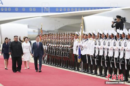 9月18日,韩国总统文在寅抵达朝鲜平壤,朝鲜最高领导人金正恩携夫人李雪主到机场迎接。图为文在寅与金正恩检阅朝鲜仪仗队。 平壤联合采访团供图
