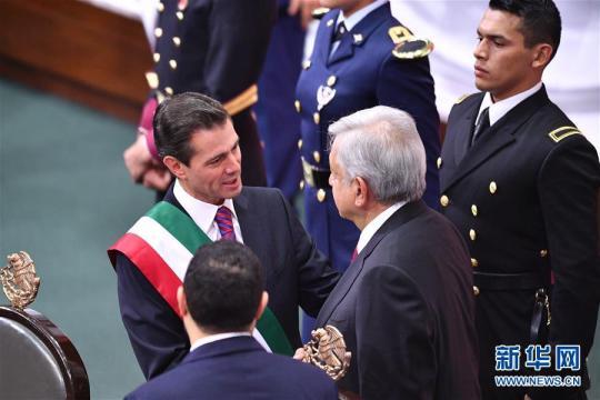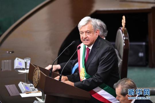 12月1日,在墨西哥首都墨西哥城,安德烈斯·曼努埃尔·洛佩斯·奥夫拉多尔发表总统就职演说。 当日,墨西哥当选总统安德烈斯·曼努埃尔·洛佩斯·奥夫拉多尔从恩里克·培尼亚·涅托手中接任总统一职,正式成为墨西哥总统。 新华社记者辛悦卫摄