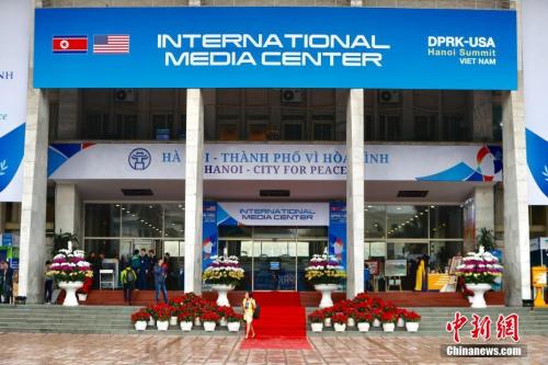 资料图:当地时间2月26日,越南政府为参与第二次“金特会”报道的各国媒体记者所设置的国际媒体中心,各国记者可在此领取峰会证件。中新社记者 富田 摄