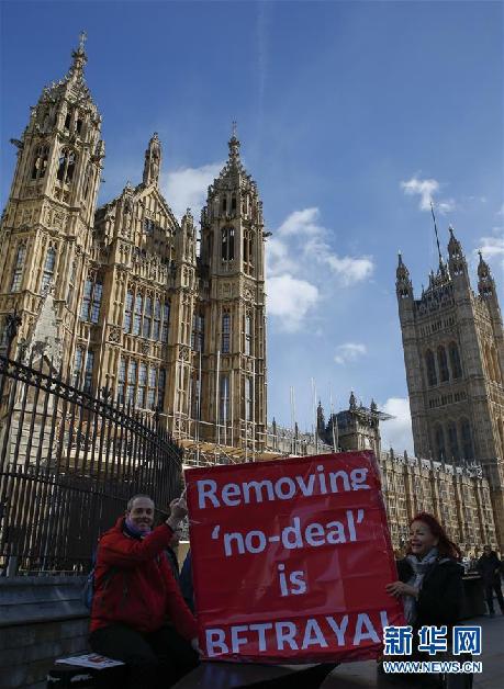 3月14日,在英国伦敦,示威者手持标语站在议会大厦外。新华社记者韩岩摄