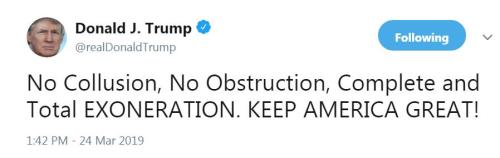 特朗普在巴尔结论公开后在社交网站“推特”上说:“没有通俄,没有干预司法,完全无罪。让美国保持伟大!”
