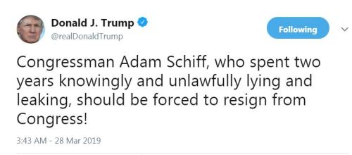 另一方面,28日,特朗普在社交网站上发言,指责民主党籍的众议院情报委员会主席希夫过去两年在没有证据的情况下, “故意并非法地撒谎和泄漏”通俄调查。特朗普称,他“应该被强制辞去国会的职务!”