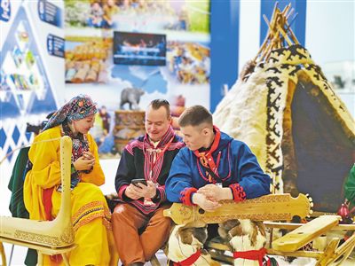北极论坛期间,会议中心展示的北极地区居民生活场景。本报记者 吴 焰摄