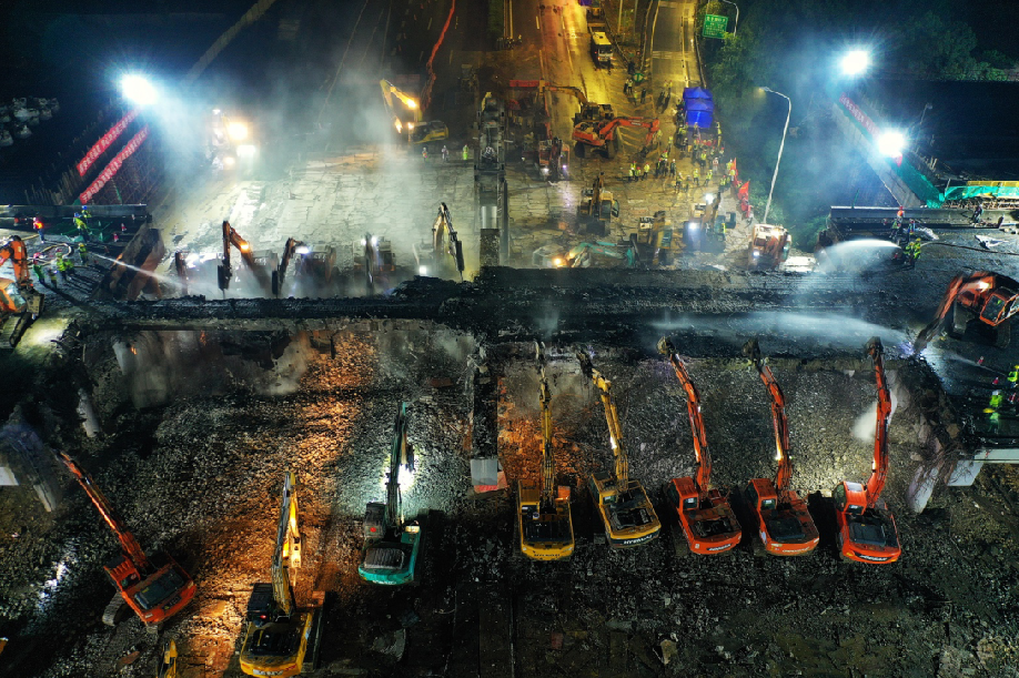图为5月26日凌晨拍摄的芙蓉大道京沪高速跨线桥拆除施工现场。新华网 发