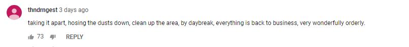 网友“thndrngest”称赞道:“拆除、清洁施工现场、清理整个区域,天亮之后,一切都恢复了运行,非常有序。”