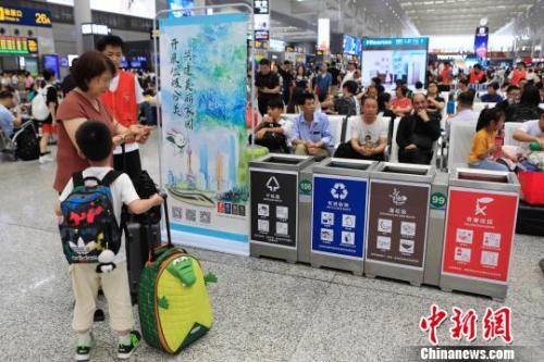 资料图:铁路上海虹桥站候车室内宣传垃圾分类知识。 殷立勤 摄