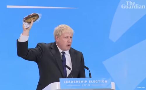 近日,约翰逊在保守党的一场竞选活动中讲到为何脱欧时,突然拿出了一条腌鱼举例。图片来源:英国《卫报》视频截图。