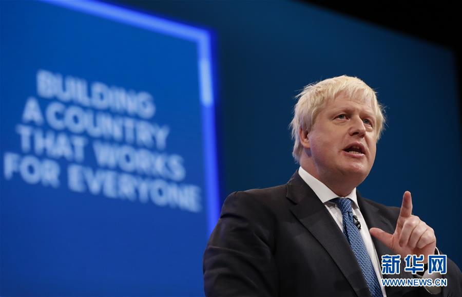 英国前外交大臣、伦敦前市长鲍里斯·约翰逊7月23日当选执政党保守党领袖,将接任英国首相。 这是2017年10月3日,在英国曼彻斯特,时任英国外交大臣鲍里斯·约翰逊在2017年英国保守党年度大会发表主旨演讲。 新华社记者韩岩摄