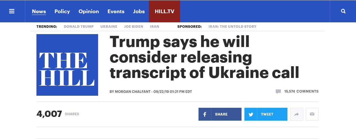 在刚刚过去的这个周末,多家美媒爆料说,特朗普今年7月曾在电话中对乌克兰总统泽连斯基施压,敦促其调查自己的竞争对手、民主党总统候选人乔·拜登的儿子亨特。面对外界要求特朗普公布通话记录的声音,《国会山报》22日报道称,这位美国总统当天在休斯顿“承诺”说,他会对公布通话细节进行“讨论”,“我们将对如何公布那些话,对公布那些我们(特朗普与乌克兰总统泽连斯基)说过的话做出一个决定。”