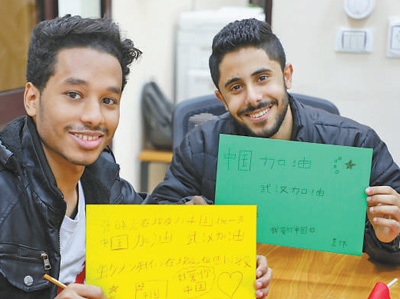 图为埃及艾因夏姆斯大学学生手写标语,为中国抗击疫情加油。本报记者 周 輖摄
