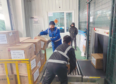 在日本疫情防控的关键期,黑龙江省向缔结友好关系的日本北海道捐赠一批医用口罩。图为工作人员正在装运口罩,准备运往日本。中国驻日本大使馆供图