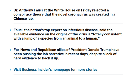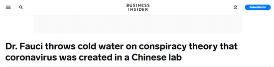 美媒商业内幕网站在一篇题为“福奇博士给‘病毒由中国实验室制造’的阴谋论泼了一盆冷水”的文章中,还原了福奇当天在白宫疫情简报会上的表态。