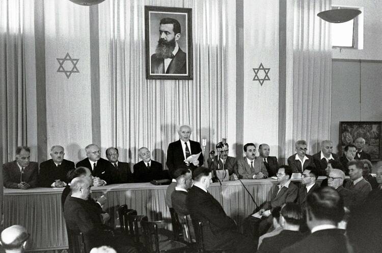 △1948年5月14日,以色列第一任总理戴维·本-古里安在特拉维夫现代艺术博物馆宣布了以色列国的成立。