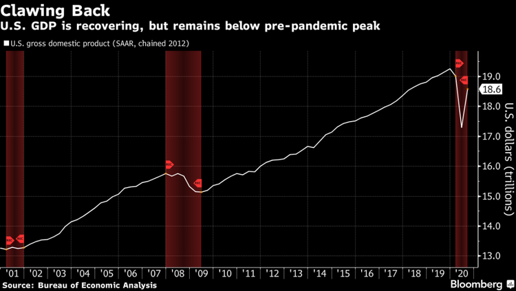 △彭博社:美国经济正在恢复,但仍低于疫情前的峰值。