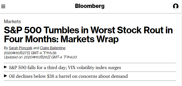 △彭博社:标普500指数大跌,创下四个月来最大单日跌幅。