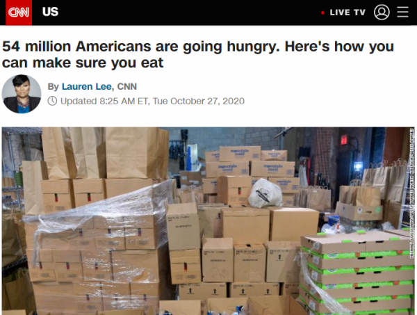 而美国民众的现实生活所受到的冲击更为触目惊心。美国有线电视新闻网(CNN)援引非营利组织“赈饥美国”数据称,由于政府救济断供,美国有多达5400万人可能很快将面临食品短缺问题。