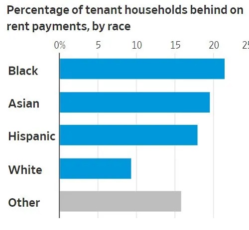 △美国人口普查局9月的调查显示,少数族裔租房家庭拖欠租金的比例远高于白人。
