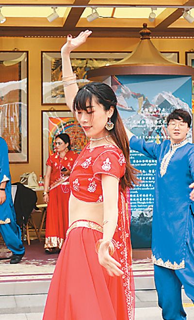 尼泊尔非物质文化展示区前的歌舞表演。 人民日报海外版记者 徐佩玉摄