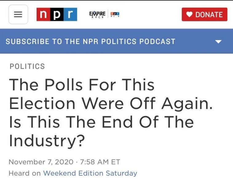 △美国国家公共广播电台11月7日发表评论《大选民意调查再次给出错误预判,这是民调业的终结吗?》,直指各大民调机构错误估计了真实民意,并探讨了背后原因。