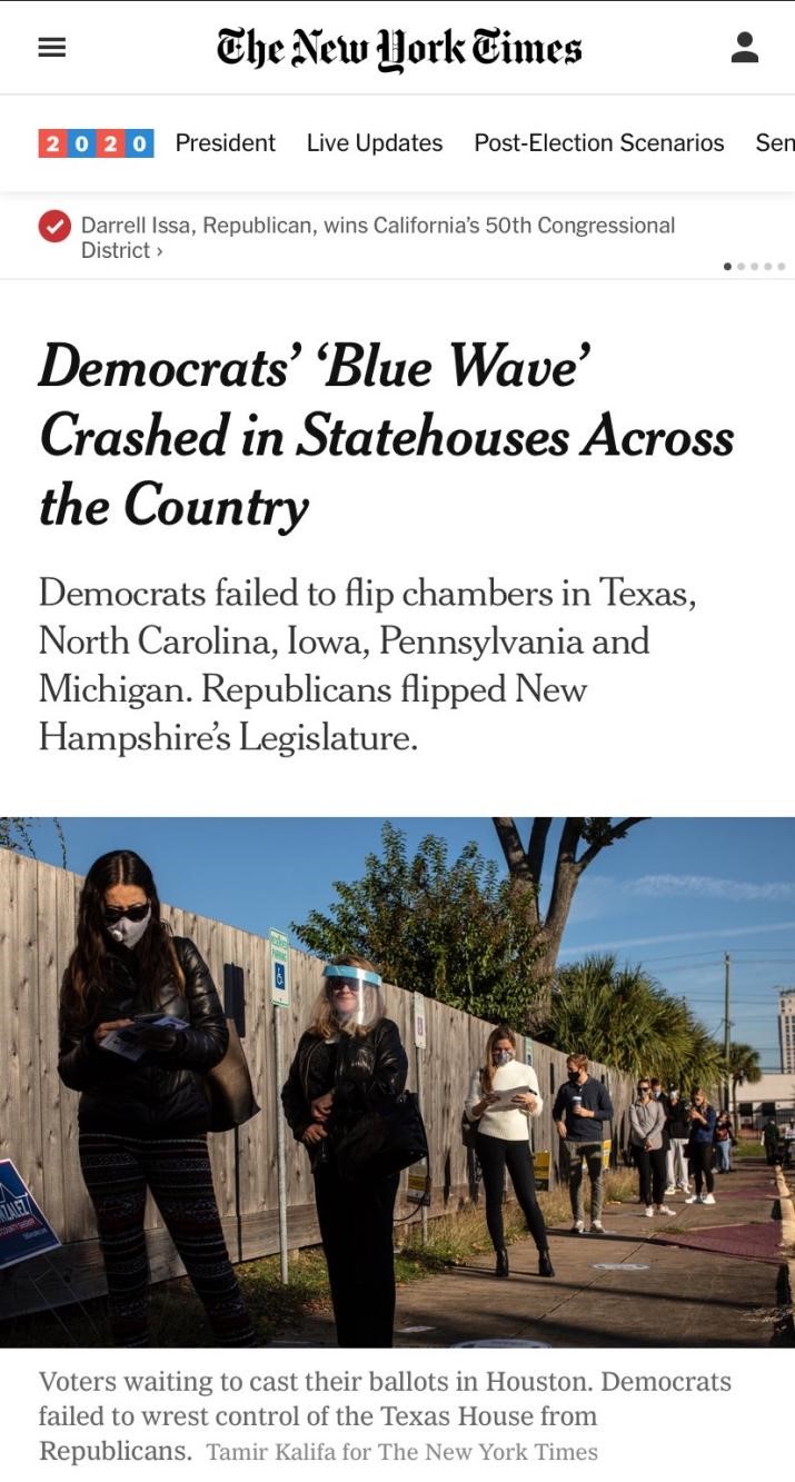 △《纽约时报》报道,民调预测的民主党“蓝色浪潮”在全国范围内的众院选举中并未出现