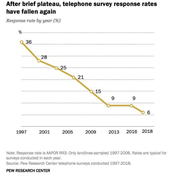 △皮尤研究中心数据显示,美国人接受电话民调的积极性正在快速下降。